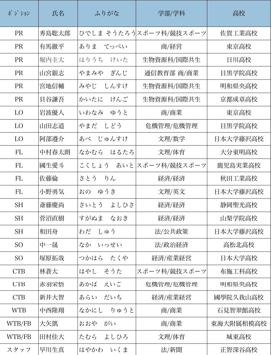 2026/04/01お知らせ 2026年度 新入部員のお知らせ この度、2026年の新入部員が決まりましたのでご報告致します。今後とも日本大学ラグビー部への温かいご声援いただけますようよろしくお願いいたします。 新着情報一覧に戻る